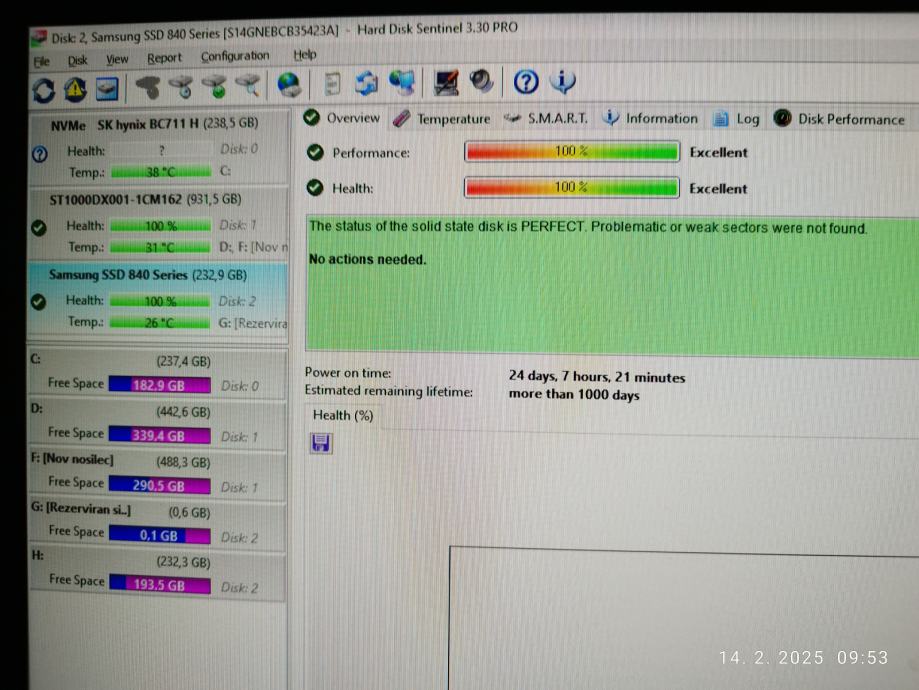 - trdi disk 250 GB SSD, znamke Samsung 840, 2,5-palčni SATA III, kot NOV, hitrosti prenosa do 540 MB/s pri branju in 520 MB/s in