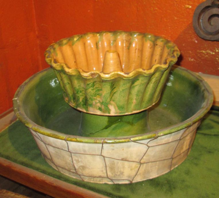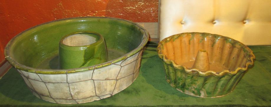 2 stara glinena pekača z zeleno glazuro, veliki ima kovinsko mrežico in premer 45 cm, manjši valoviti pa premer 28 cm.