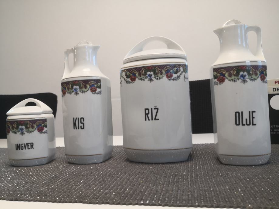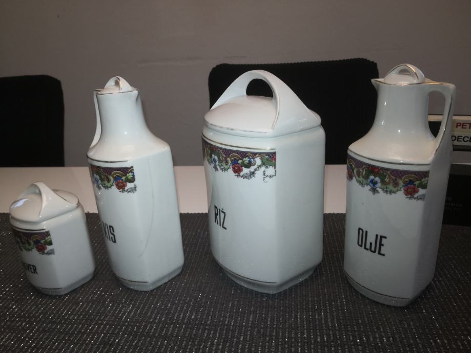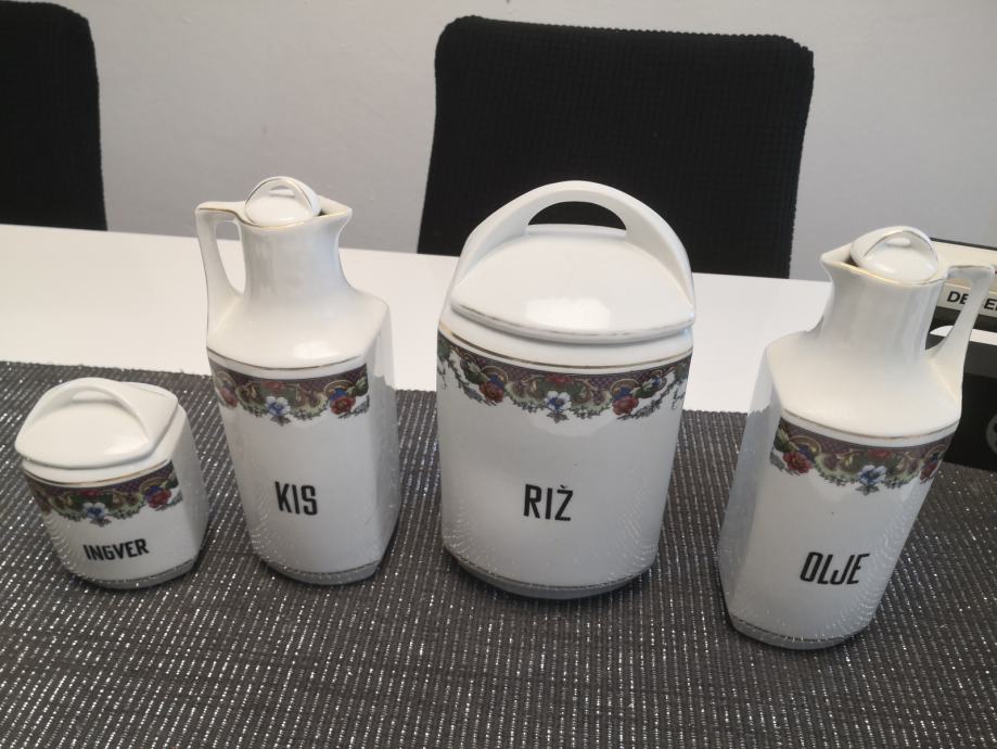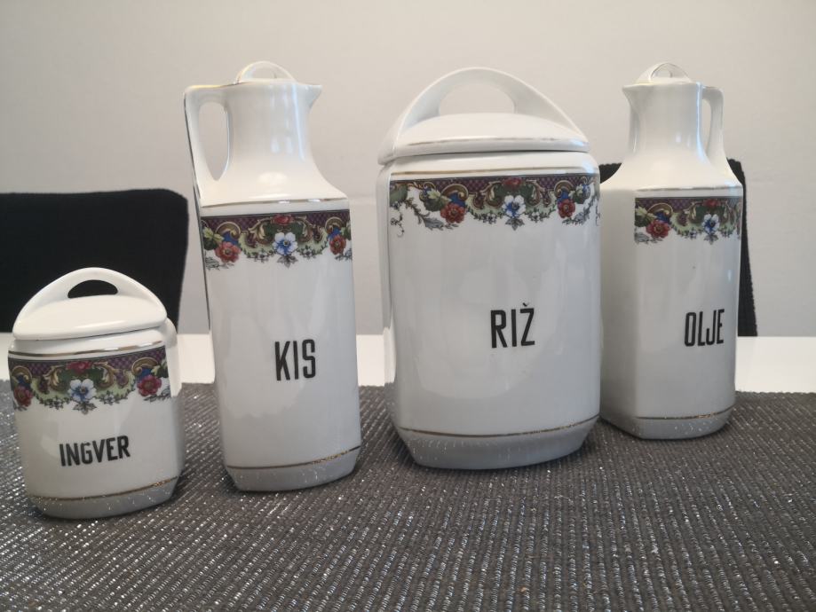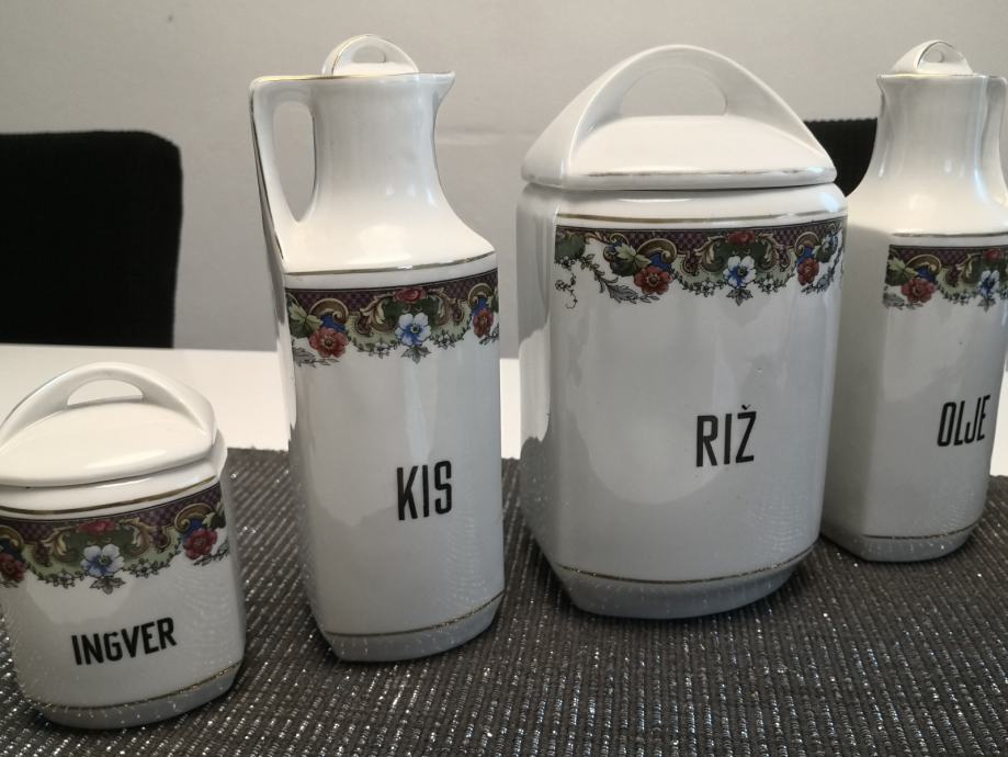 Porcelanaste posode za živila in začimbe, vse imajo pokrovčke, napisi so v slovenskem jeziku, KARLSBAD CZECHOSLOVAKIA,stara kuhinjska posoda, ,, videt sledi uporabe,,, zato taka cena,