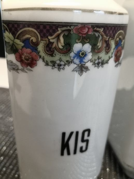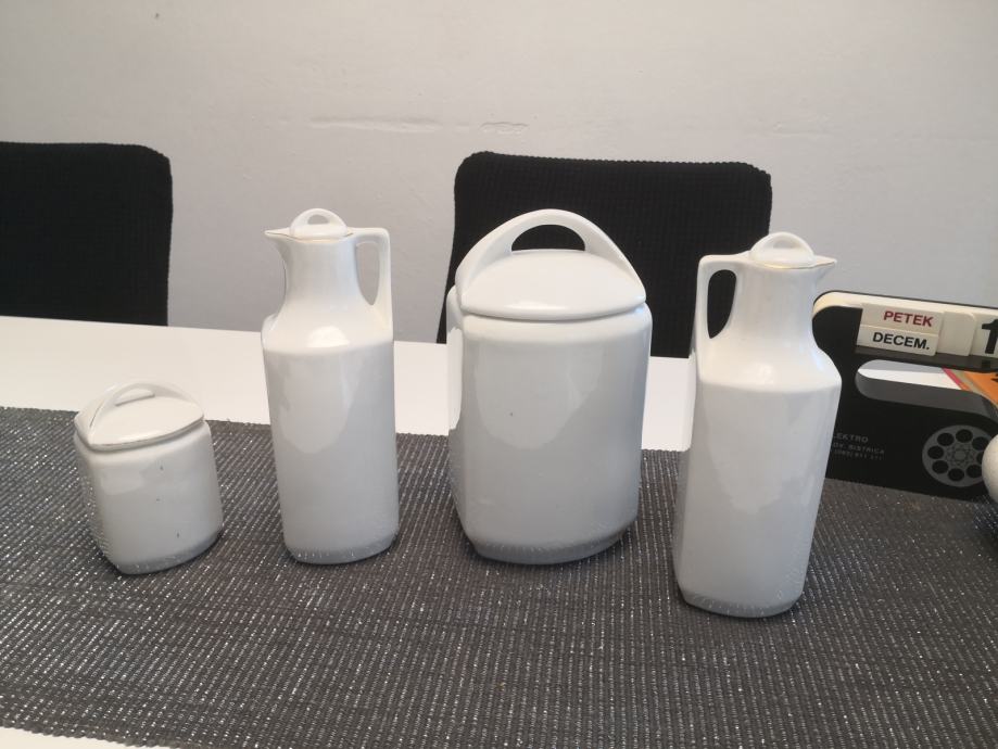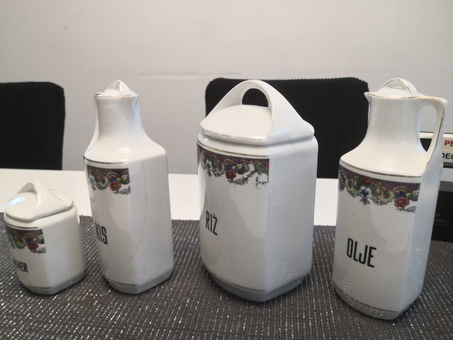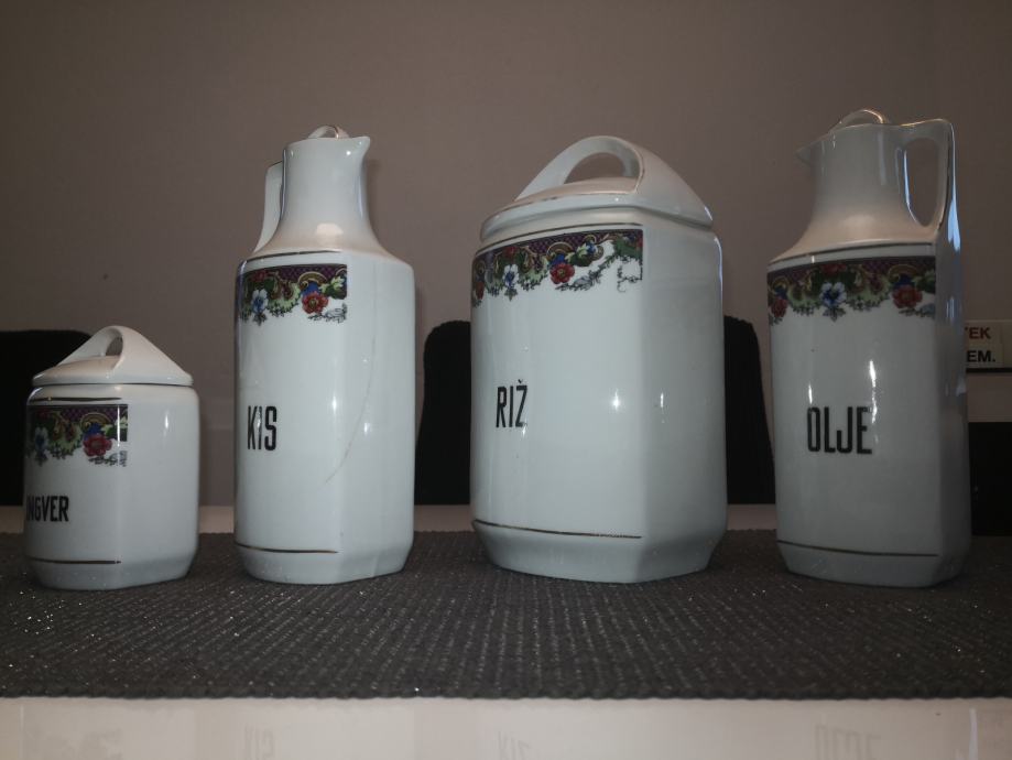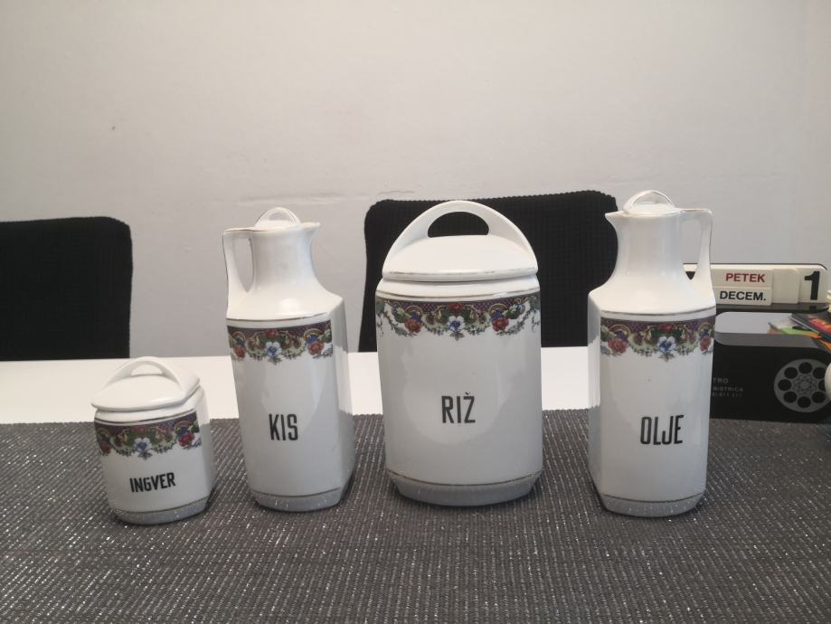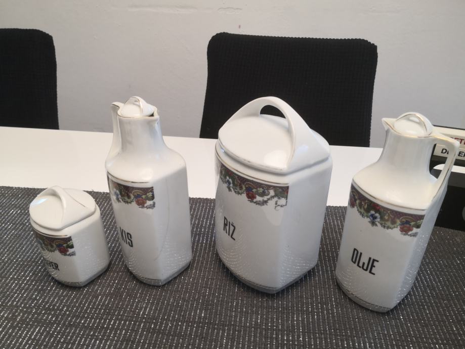 Porcelanaste posode za živila in začimbe, vse imajo pokrovčke, napisi so v slovenskem jeziku, KARLSBAD CZECHOSLOVAKIA,stara kuhinjska posoda, ,, videt sledi uporabe,,, zato taka cena,