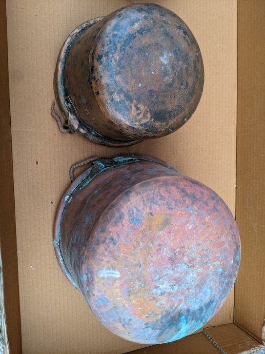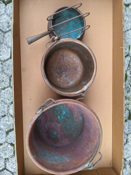 Staro preko sto let, ročno narejene (klepane). Večja 25L, srednja 12L, manjša 3L. Vse tri posode v kompletu 90€. Za okras, lahko pa tudi za nadaljno uporabo pri krušni peči ali odprtem ognjišču. 041-221-648
