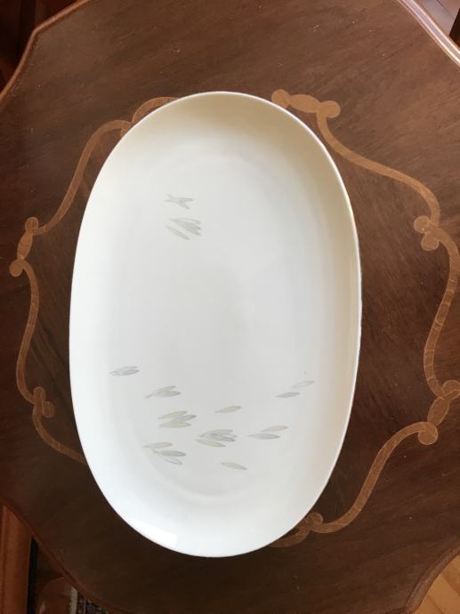 Prodam velik ovalen porcelanast krožnik Bavaria. Dolžina 33 cm x 21 cm. Barva je temnejša bela / barva starega porcelana. Poslikan je z nevpadljivimi lističi pastelnih barv. Rob ima tenko pozlato.