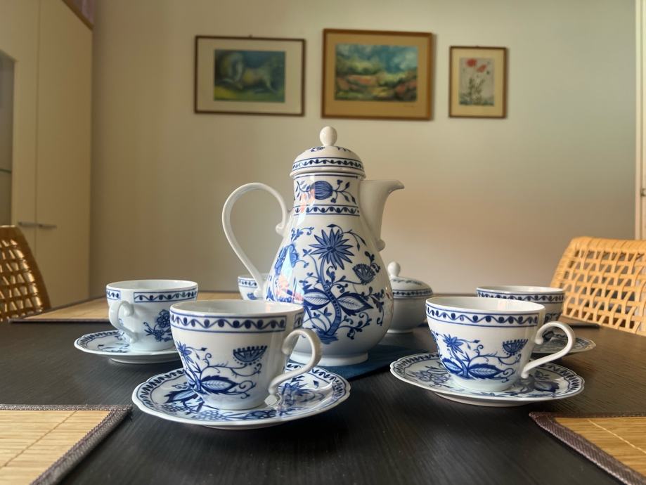 Čudovit, vintage čajni servis iz porcelana s čebulnim vzorcem (Kahla Zwiebelmuster Porzellan), prodam. Servis vsebuje: vrč s pokrovčkom, posodo za sladkor s pokrovčkom in pet skodelic s pripadajočimi krožniki.