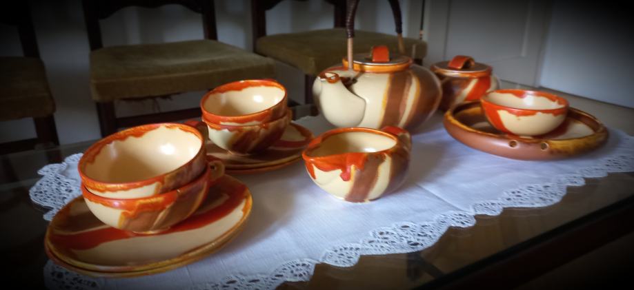 Servis SMF Majolikafabrik Schramberg je izdelan iz ročno barvane keramike in zajema 5 skodelic s krožniki, čajnik, krožnik za pecivo, sladkornico in posodico za mleko. Cena za komplet je 25 EUR.