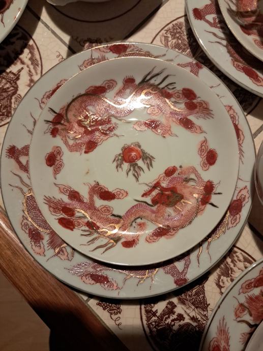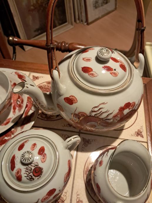 Na voljo je izjemno lepo ohranjen vintage čajni servis iz finega porcelana, z poslikanimi rdeče-zlatimi zmaji in tradicionalnimi oblaki. Komplet vključuje čajnik z bambusovim ročajem, sladkornico, vrček za mleko, skodelico ter dva krožnika z ujemajočo dekoracijo. Vsi kosi so usklajeni v motiviki, ki črpa navdih iz kitajske mitologije in umetnosti.