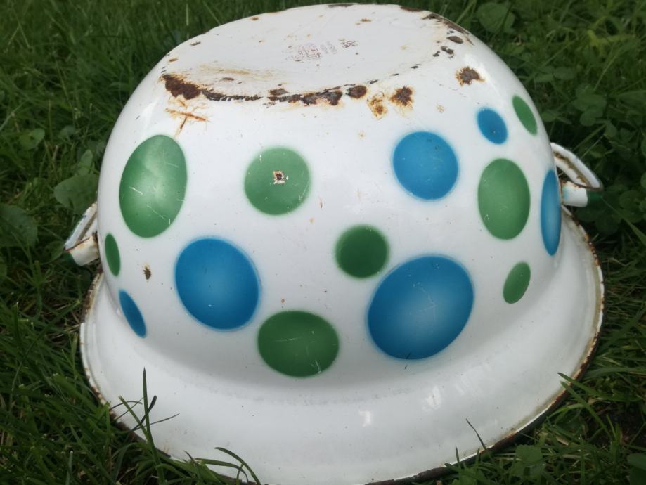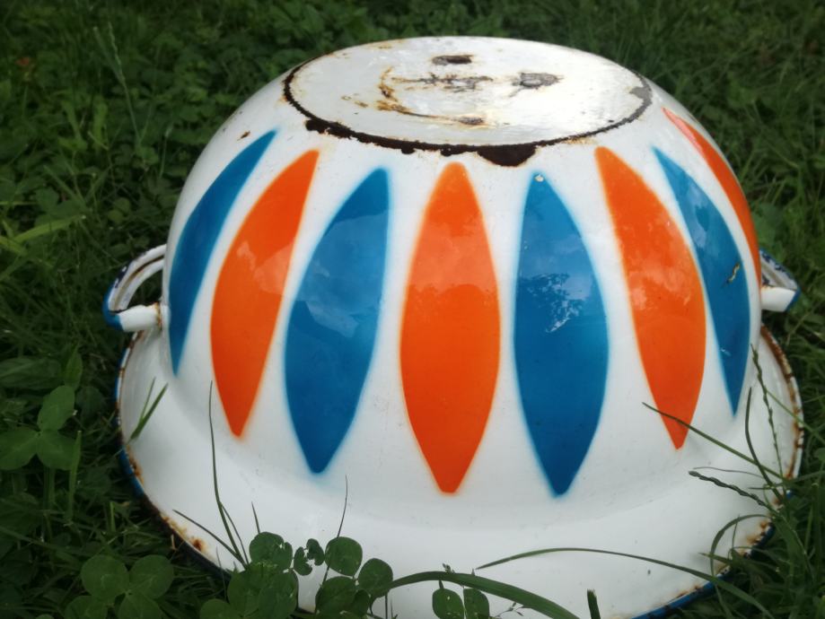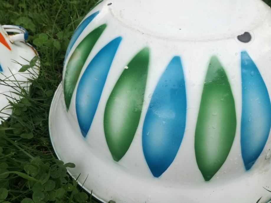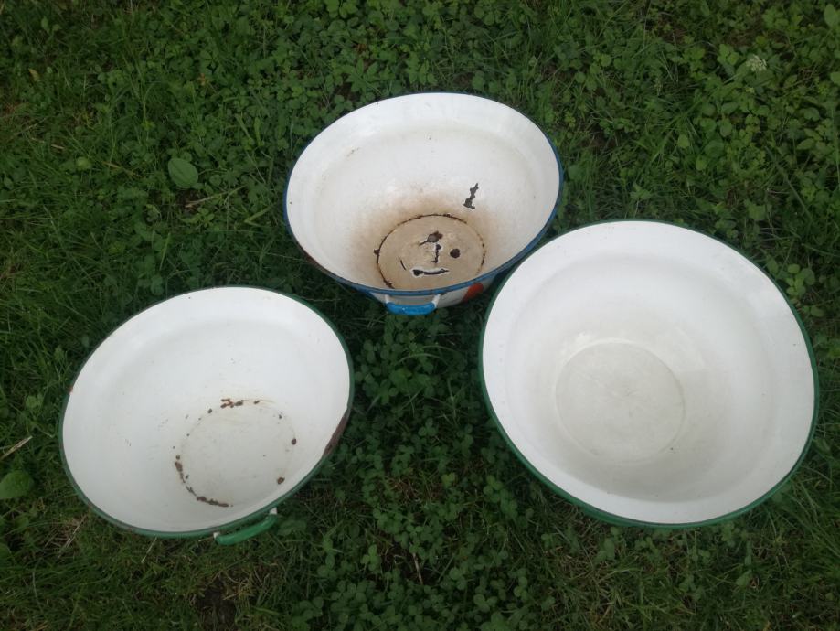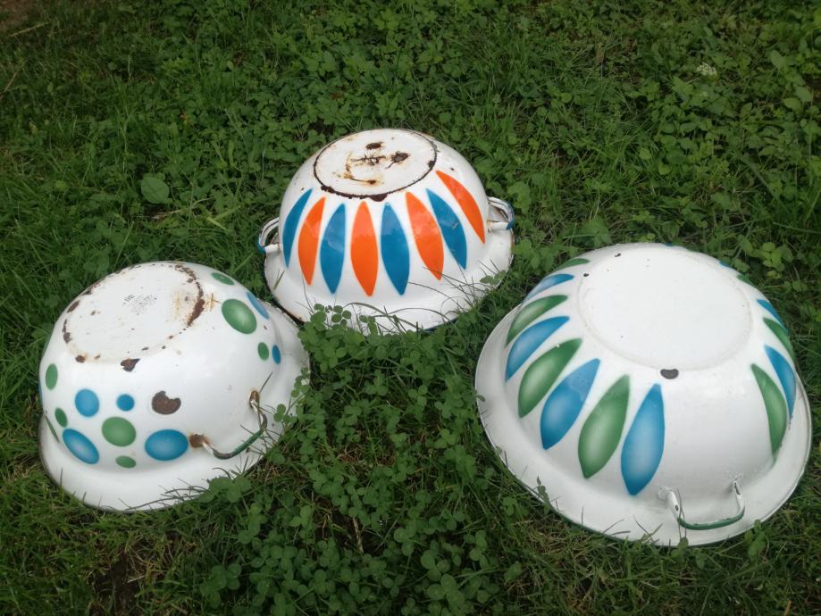 Velike emajlirane posode s pisanimi vzorci, premer 37cm, 41cm, 41cm.