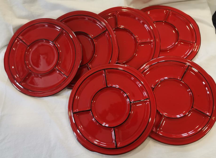 Prodam lepo ohranjen komplet 6-ih velikih krožnikov KIL, s 5-imi predelki za prigrizke, fondue....