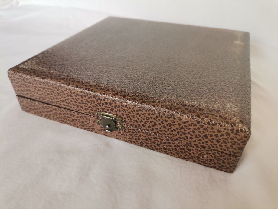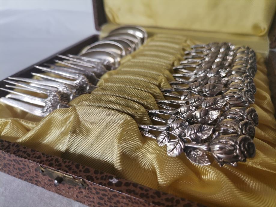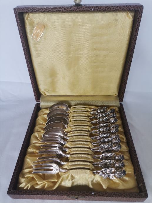 Komplet srebrnih čajnih žličk in desertnih vilic, srebro čistine 800/1000, Theo Wenzel , Berlin v originalni embalaži, 6 žličk in 6 vilic. Vilice in žličke imajo sledove starostne patine.
