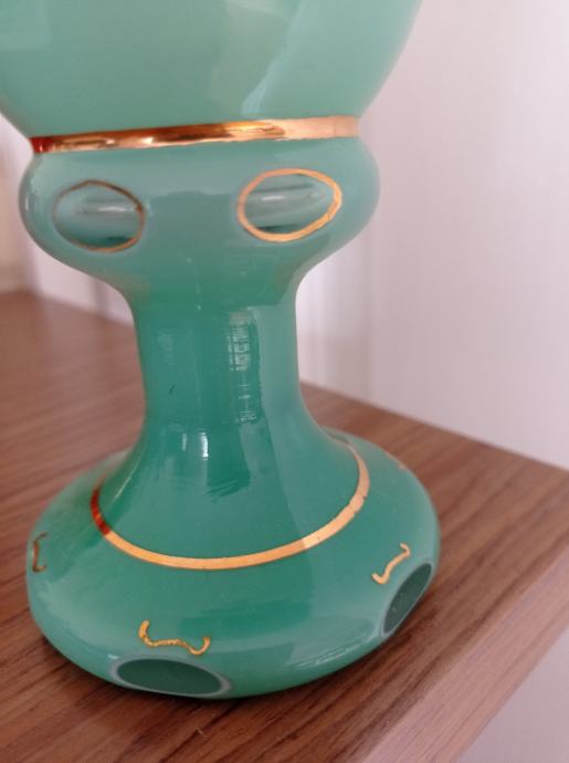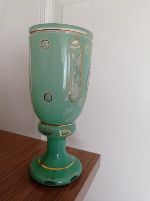 Prodam starinski kozarec ali vaza zeleno bele barve, na kozarcu sta 2 angela. Višina 18,5 cm . Lepo brušeno steklo . Kozarec ni poškodovan, dobro ohranjen.