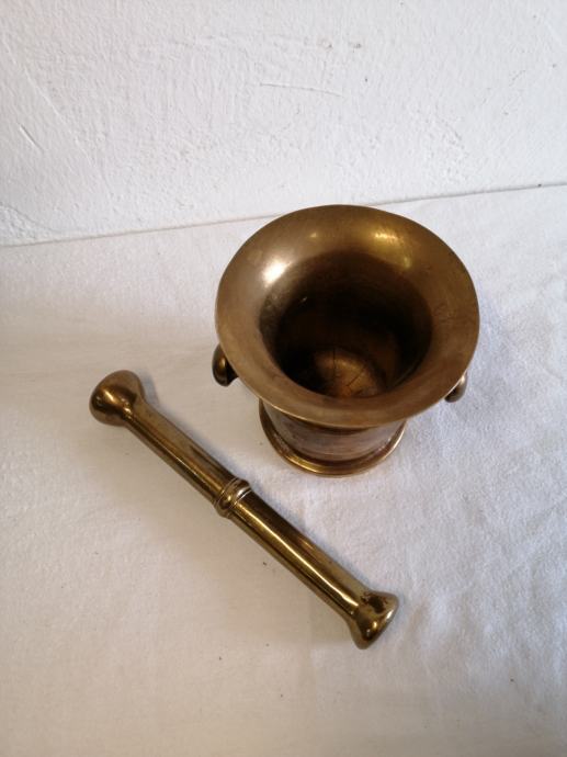 Prodam izjemno lepo ohranjen medeninast drobilec oziroma terilnik. Izdelek je lepo viden na dodanih fotografijah. Gre za redek zbirateljski kos. V kompletu prodam posodo in terilno palico, prav tako narejeno iz medenine.