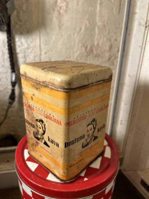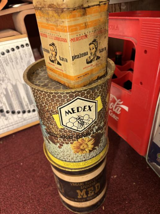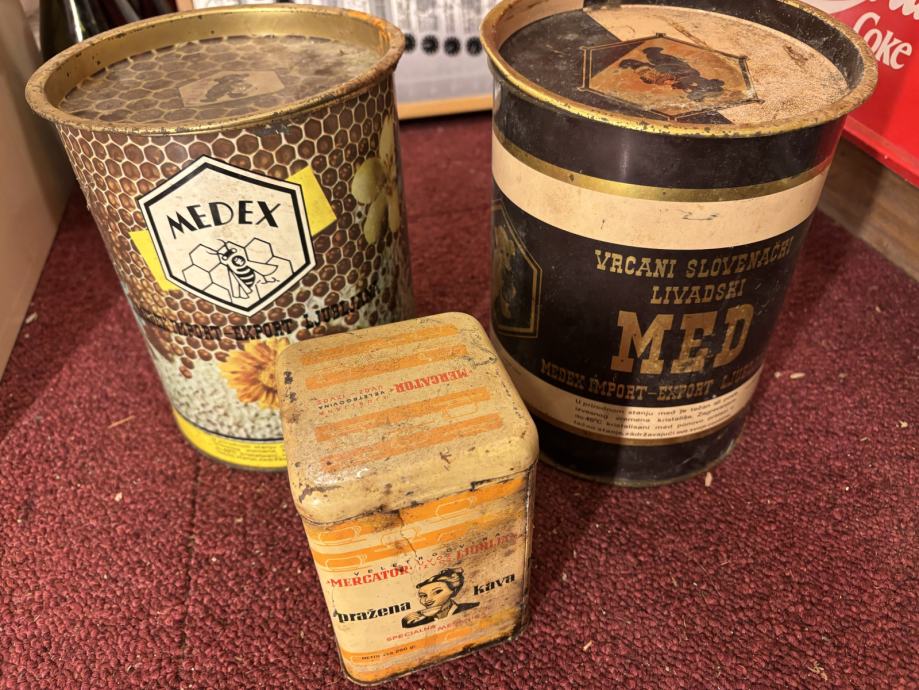 Komplet treh pločevinastih škatel 2xSaturnus MEDEX in 1x PRAŽENA KAVA Mercator