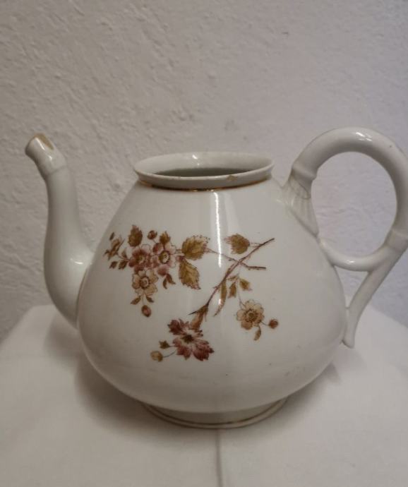 Naprodaj je en majhen starinski vrček z rožicami za nalivanje čaja ali druge tekočine, viden na fotografiji v tem oglasu.