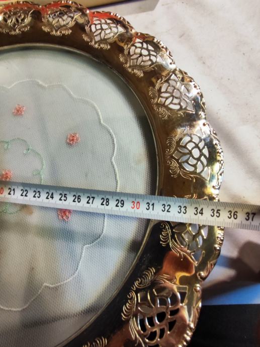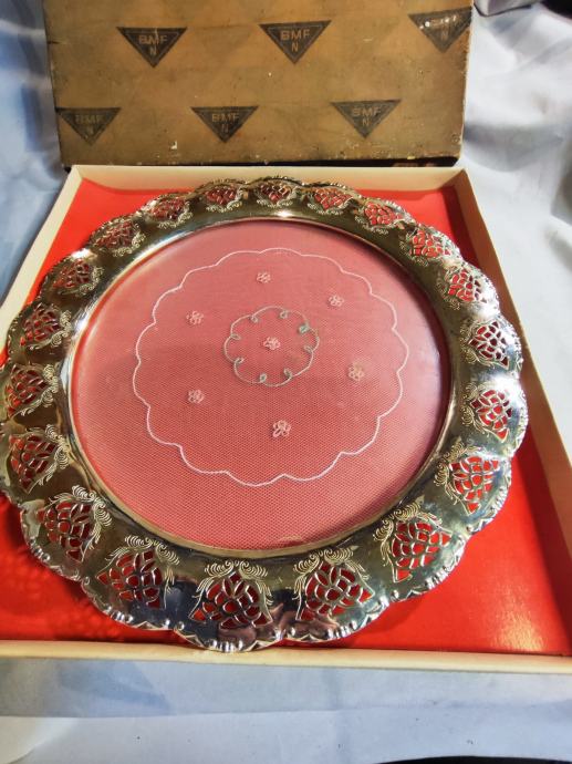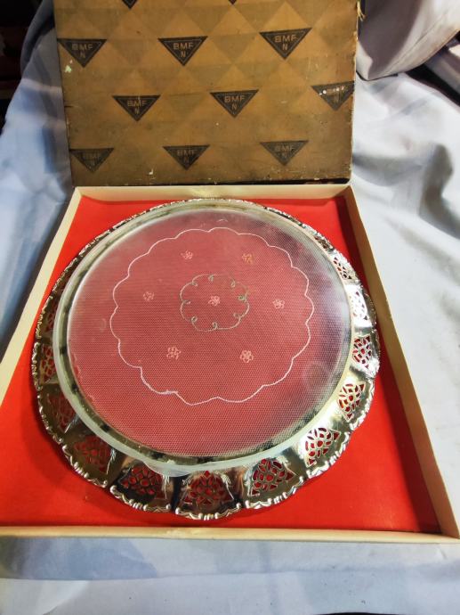 Eleganten, star pladenj , posrebrena kovina s steklom 36 cm plošča za torto.