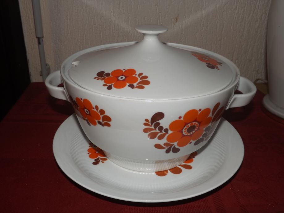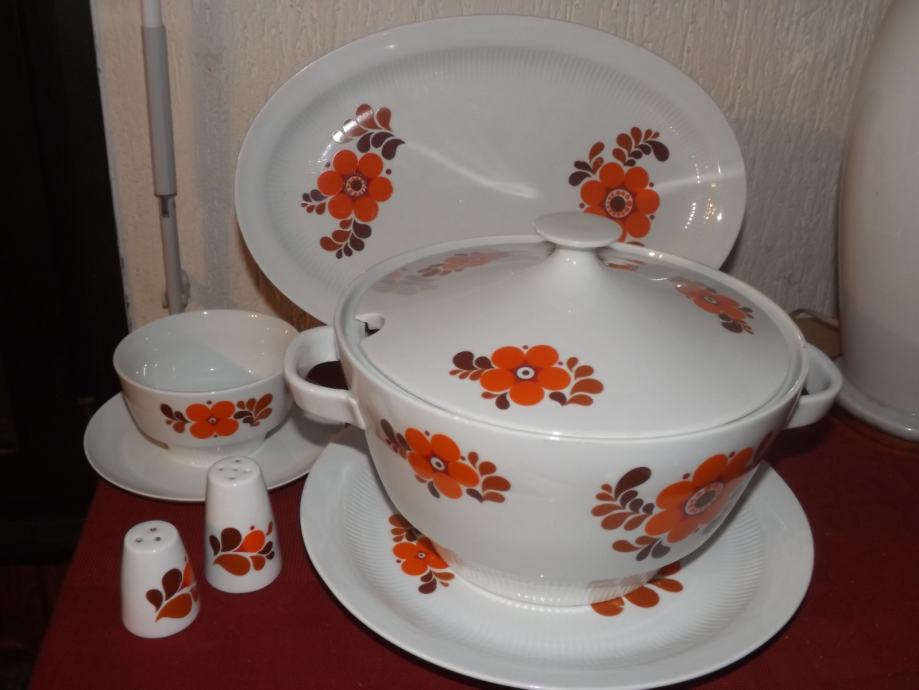 Prodajam lepo ohranjen in nepoškodovan retro porcelan set - jušnik, velik desertni krožnik, oval, omačnico ter komplet sol poper. Vrhunski takrat vzhodnonemški porcelan CP COLDDITZ GDR, atraktiven barvni cvetlični vzorec, signiran - oštevilčen.