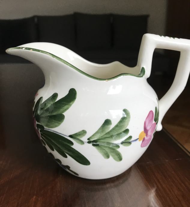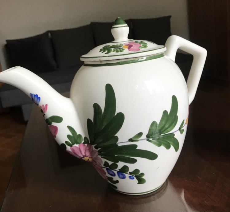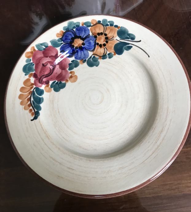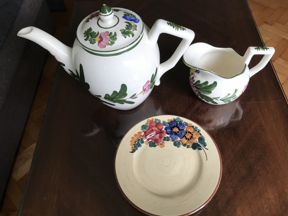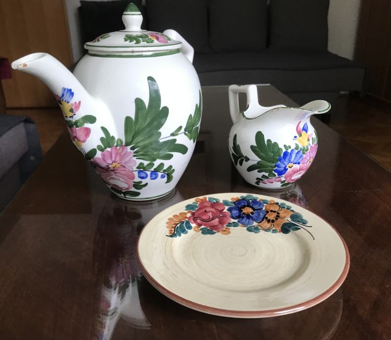 Prodam večji rustikalen keramičen čajnik, vrč in krožnik. Bogato je porisano s cvetličnimi ornamenti v živih barvah. Čajnik s pokrovom je visok 23 cm, vrč 12 cm in premer krožnika je 19 centimetrov. Vse skupaj je starejše izdelave.