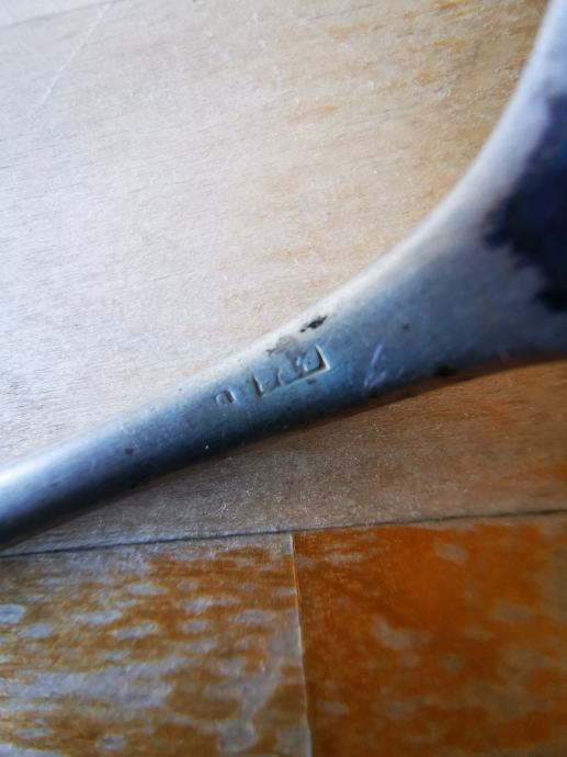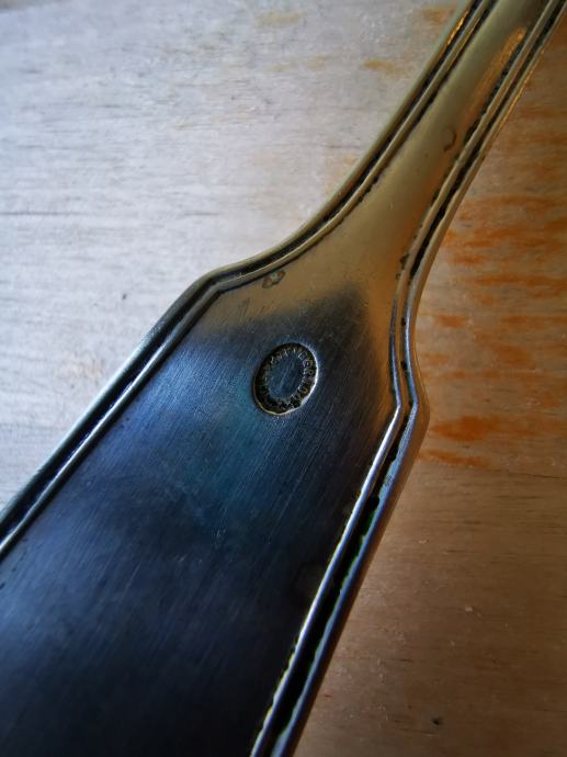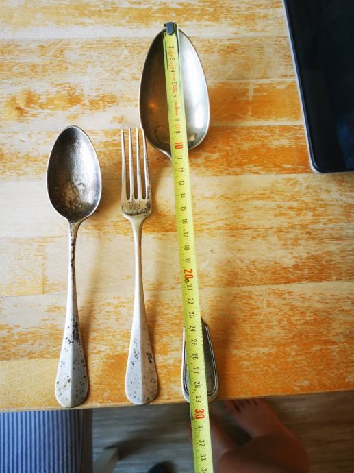 zlatar je specialnim aparato izmeril, da ni srebrno, ampak posrebreno in da zanju lahko komot vprasam 110 eur. mere in teža in žigi so kot po prilozenih fotografijah. ce vzamete še pribor - 3 kosi kot po fotografijah, vprasam 120 eur.