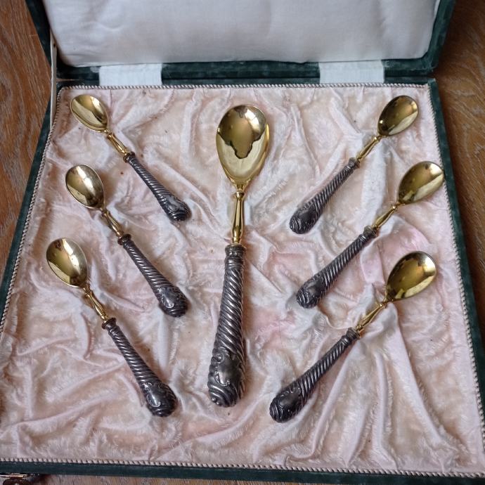 Prodam starinski komplet srebrnih žlic za desert, ročaji so iz srebra, ostali del žlic iz kovine pozlačeno. Komplet sestoji iz velike žlice 25,5 cm. + 6 manjših žlic 16 cm. Srebro 0,800 , oznaka je na žlicah.