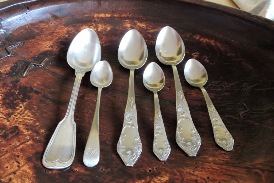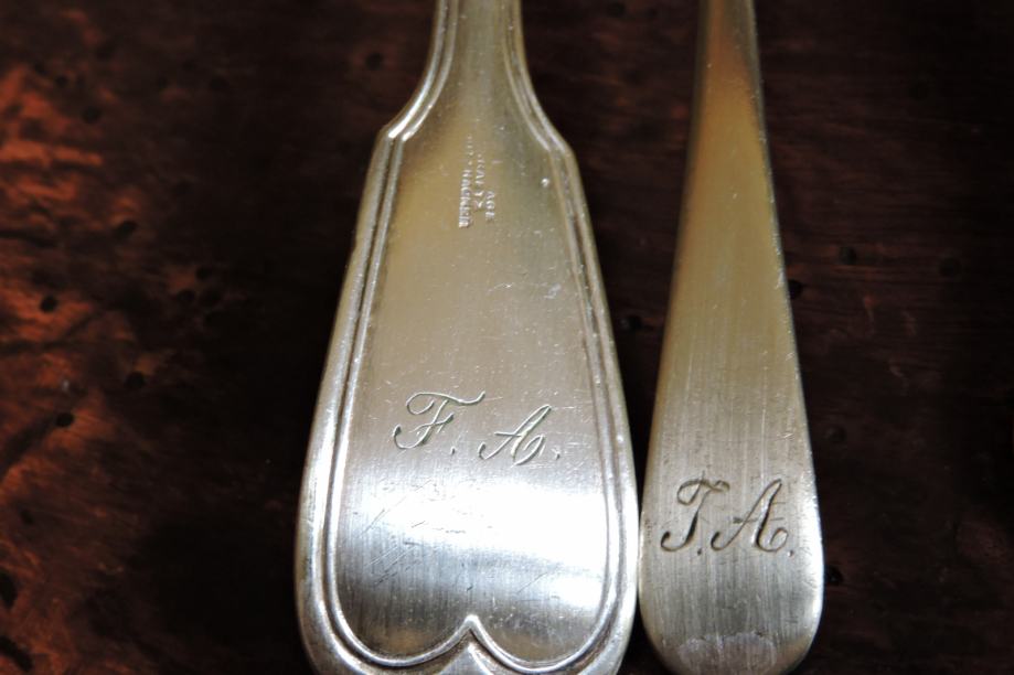 STARINSKE IZ PRED PREJŠNJEGA STOLETJA ODLIČNO OHRANJENE SREBRNE VELIKE IN MALE ŽLICE-INICIJALKE F.A. (cena ZA komplet)