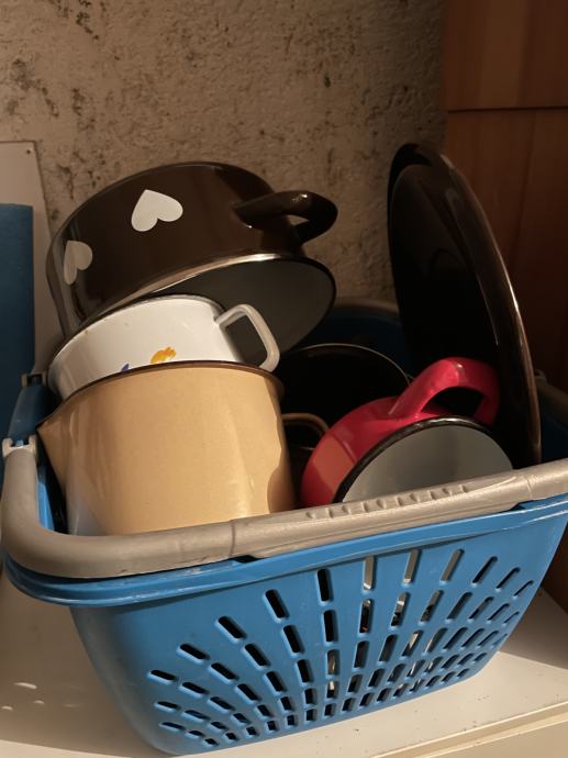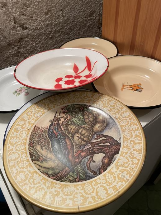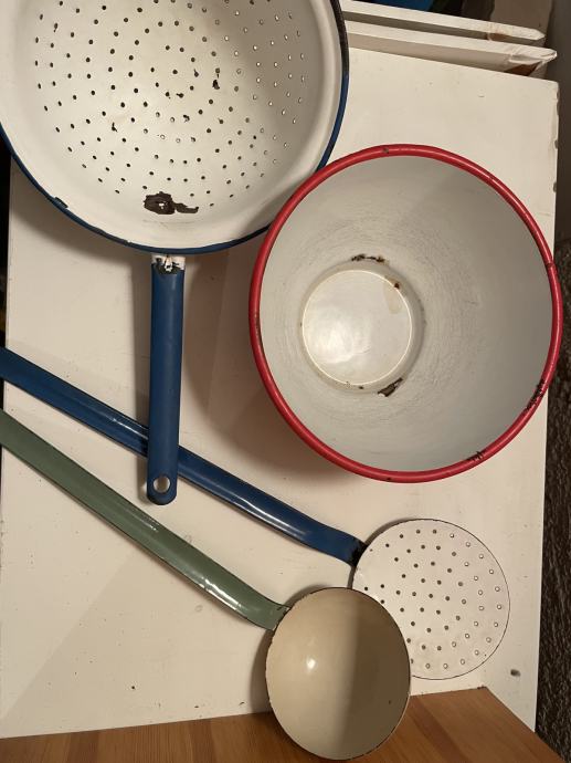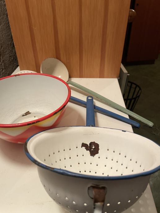 Prodam več kosov stare emajliranje posode kot je razvidno iz slik. Večino posode je izdelano oziroma z oznako EMO Celje.