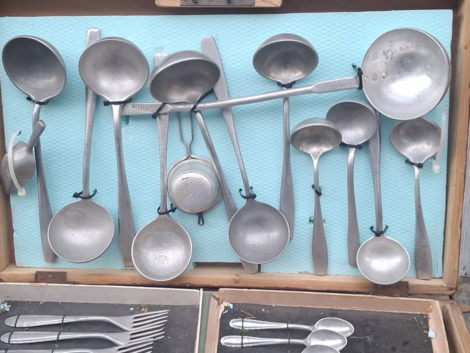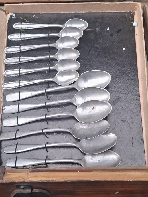 Zelo stari komplet jedilnega pribora. Komplet je v lesenem kufero z ključem.