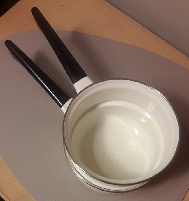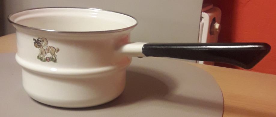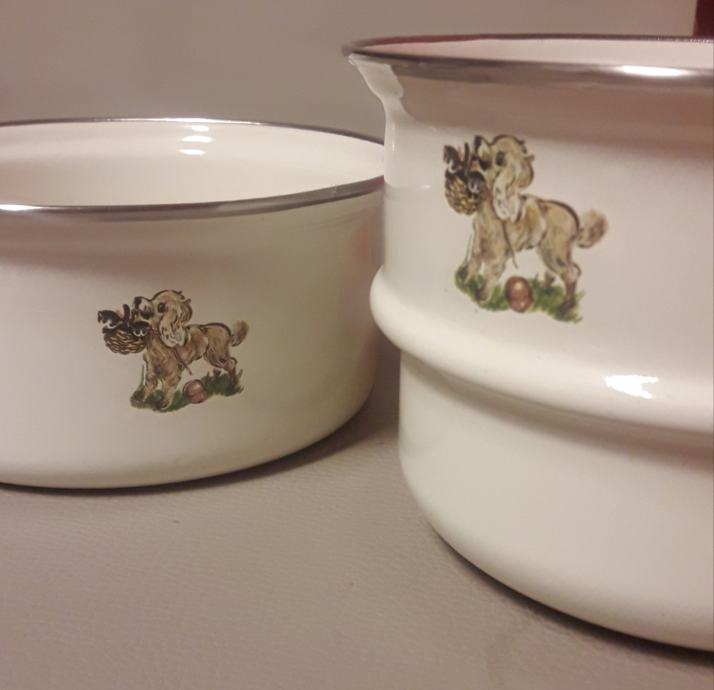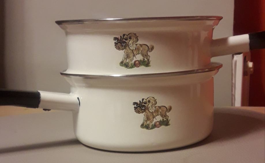 Starinska emajlirana posoda (2 kosa) iz 60-ih/70-ih let. Brezhibni. Ima žig na dnu. Popoln komplet za ljubitelje in zbiratelje starinske posode.