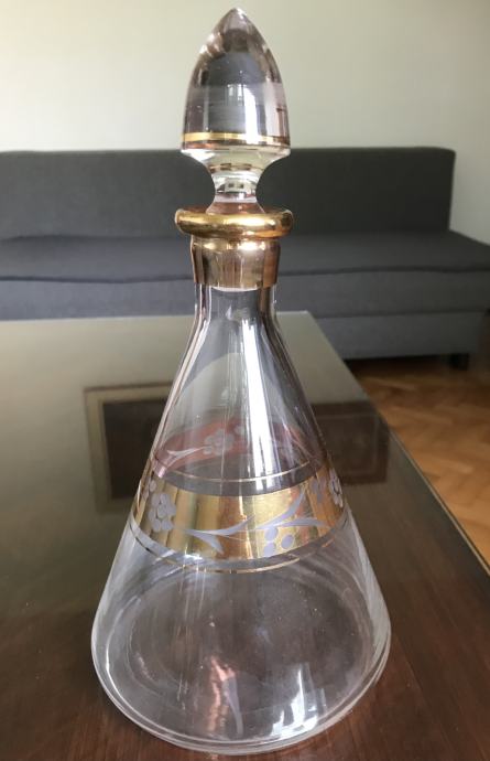 Prodam starinsko steklenico s čepom in kozarce okrašeno s peskanim okrasjem in pozlato.