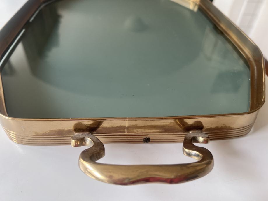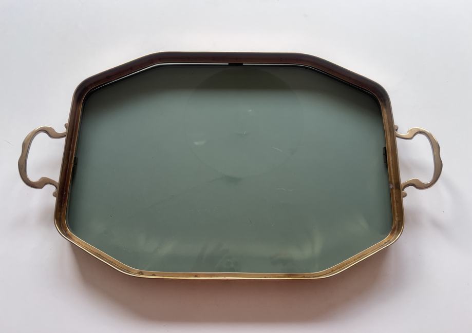 Prodam lepo ohranjen starinski pladenj z medeninastim robom in stekleno površino. Pladenj ima čudovite reliefne linije ob robovih in elegantna ročaja na obeh straneh.