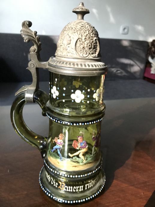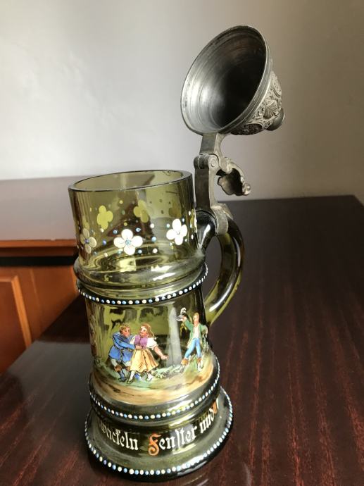 Prodam starinski nemški vrček za pivo s kositernim pokrovom, ki je ročno izdelan in poslikan v Nemčiji. Poslikava predstavlja ljudi, ki se veselijo in zabavajo.
