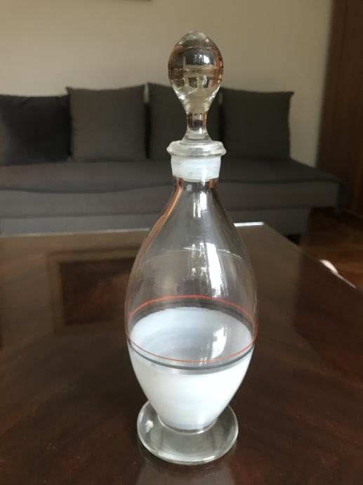 Prodam staro steklenico s čepom ki ga krasijo ravne vodoravne črte. Skupna višina je 25 centimetrov.