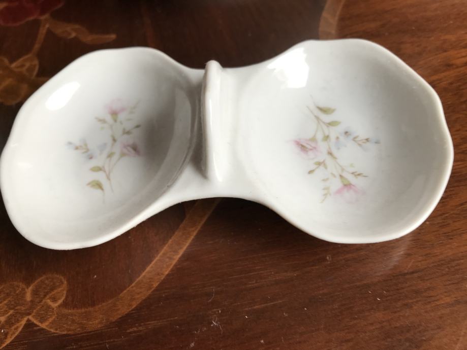 Prodam tri kose starega porcelana Titov Veles Jugoslavija, čajnik visok 18 cm, omačnico in solnico. Vsi trije kosi imajo enako poslikavo nežnega cvetličnega vzorca.