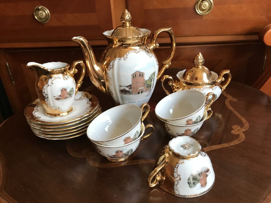 Prodam porcelanast kavni servis z motivom Trsta, firma Cristal. Posamezni kosi so bogato prevlečeni z zlato glazuro.