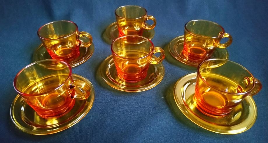 Prodam starejši komplet 6 skodelic in 6 podstavkov iz amber stekla. Skodelice do vrha polne držijo cca 0,9 dcl. Cena je za komplet.