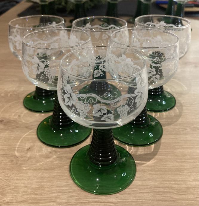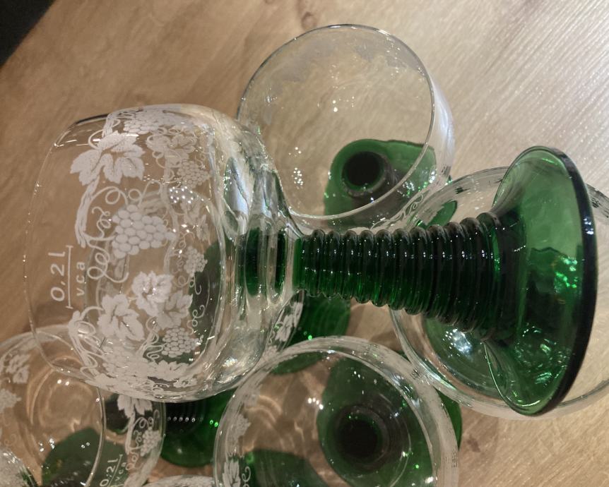Značilnost: zeleno steklo na peclju, prozorna čaša, gravura z motivom vinske trte.