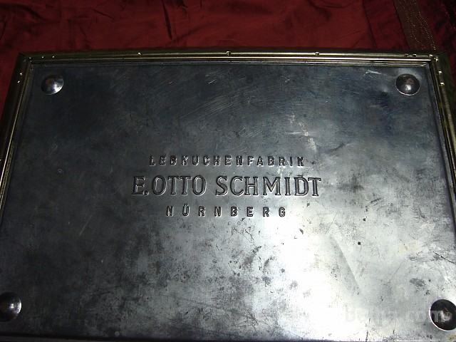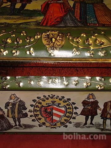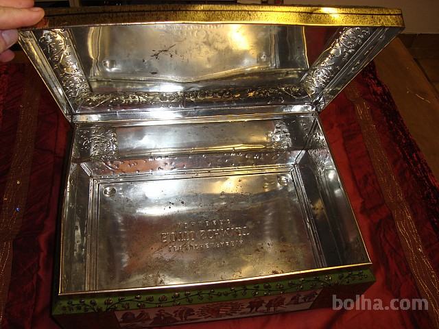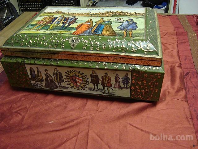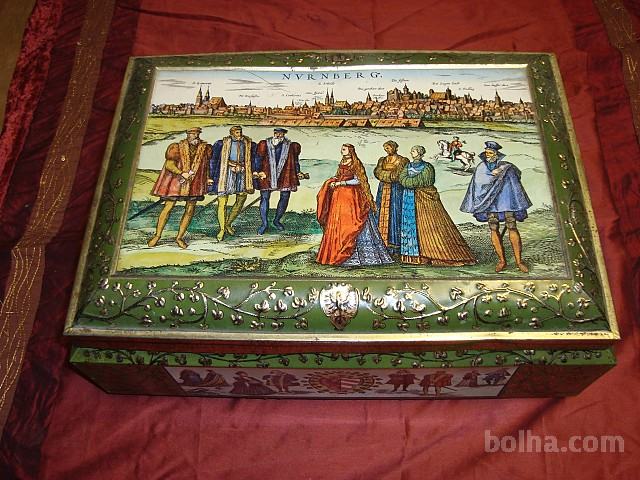 Prodaja se stara plehnata Vintage posoda za piškote, LEBKUCHENFABRIK - E.OTTO SCHMIDT z starim motivom Nuernberg -a.