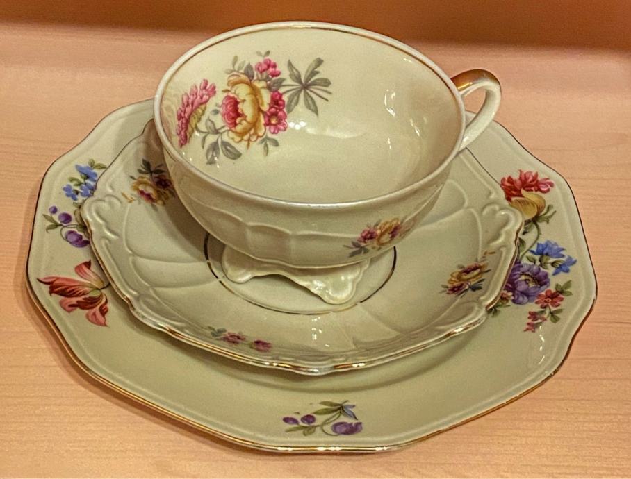 Vintage trojček skodelice, krožnička in desertnega krožnika.