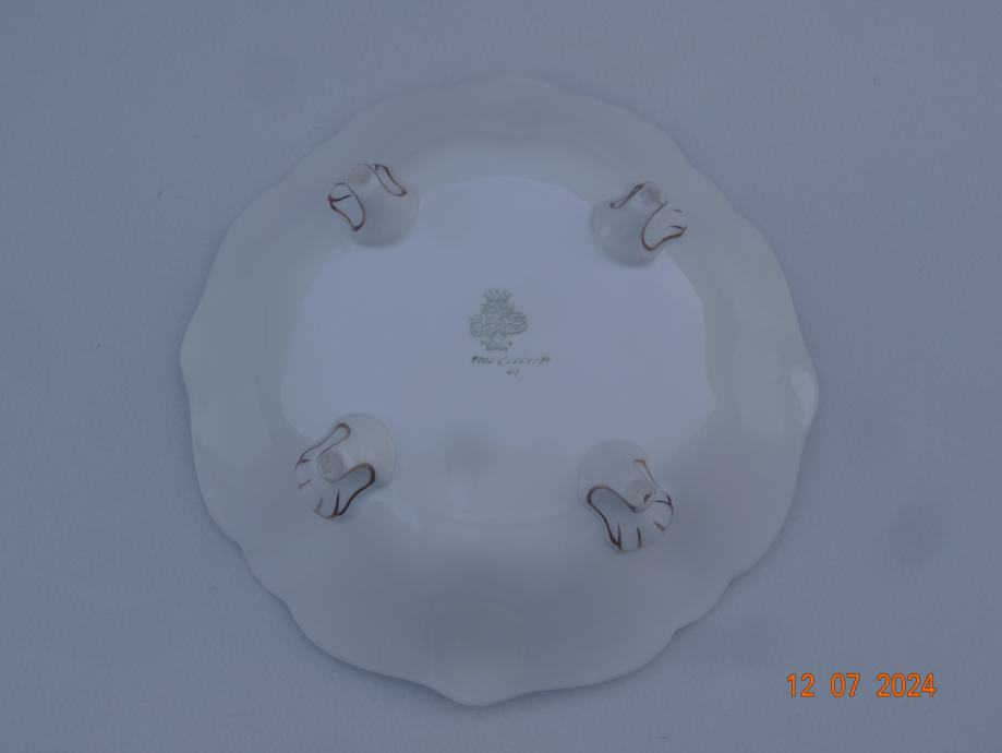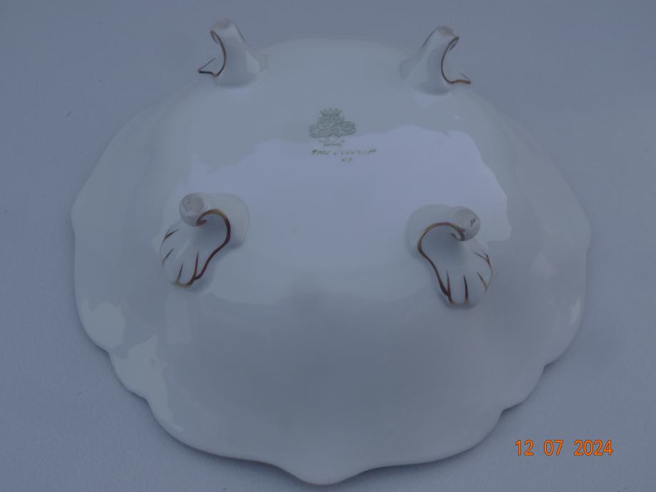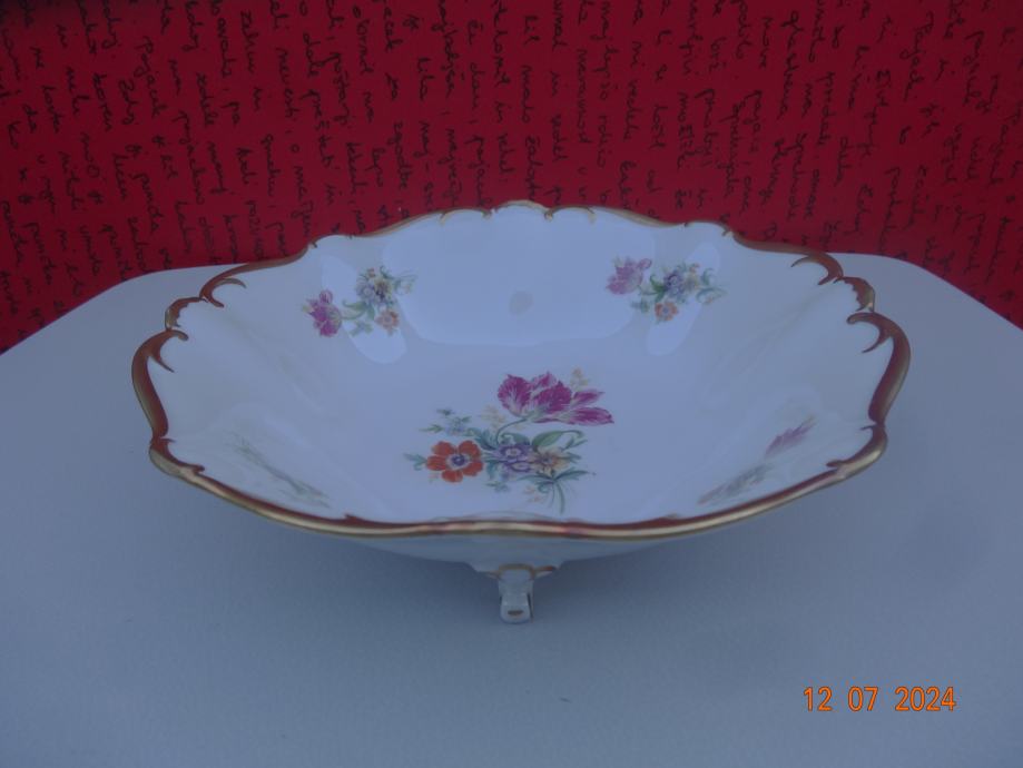 Dobro ohranjena Vintage servirna skleda na štirih nogicah, kvaliteten porcelan s poslikavo in zlato dekoracijo, premer 27 cm, višina 8,5 cm, nepoškodovana, brezhibna.