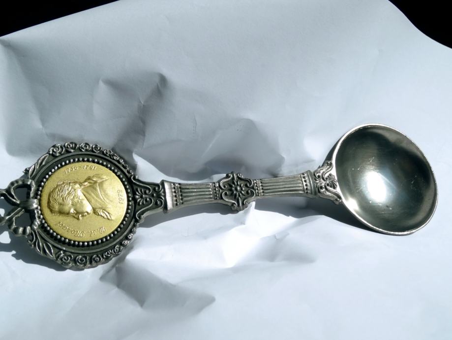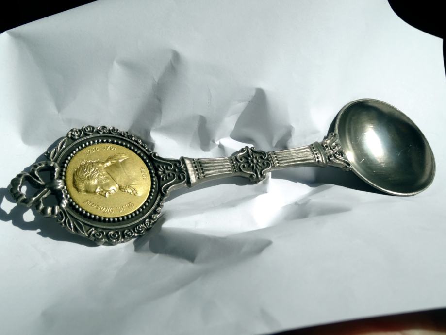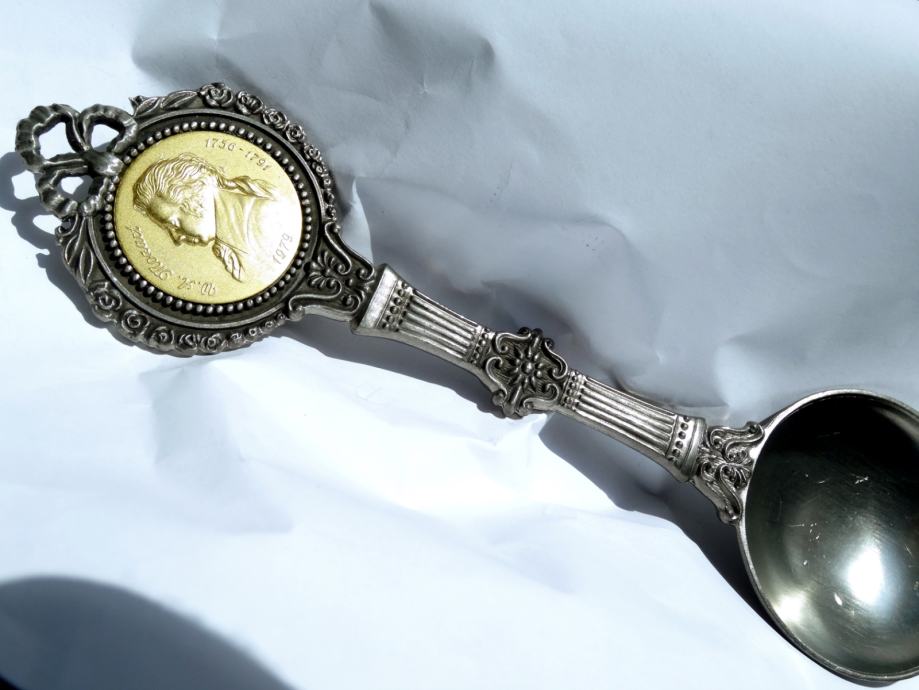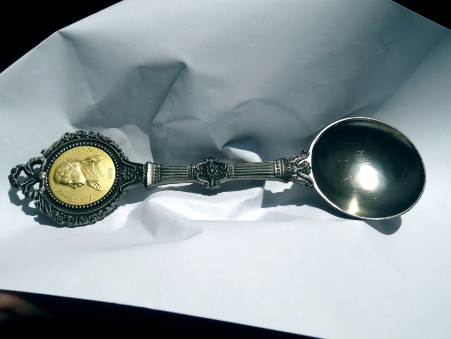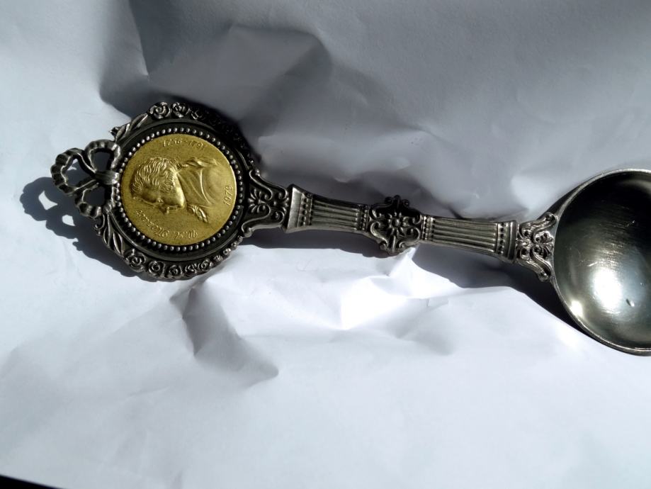 Kovanec je verjetno pozlačen. Lepa zbirateljska reč. Žlica je velika in jo je mogoče obesiti na steno z lesenim nastavkom, ki ni na slikah. Pošta 5 EUR.