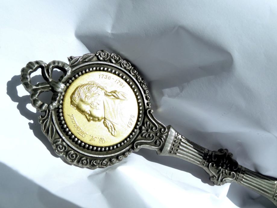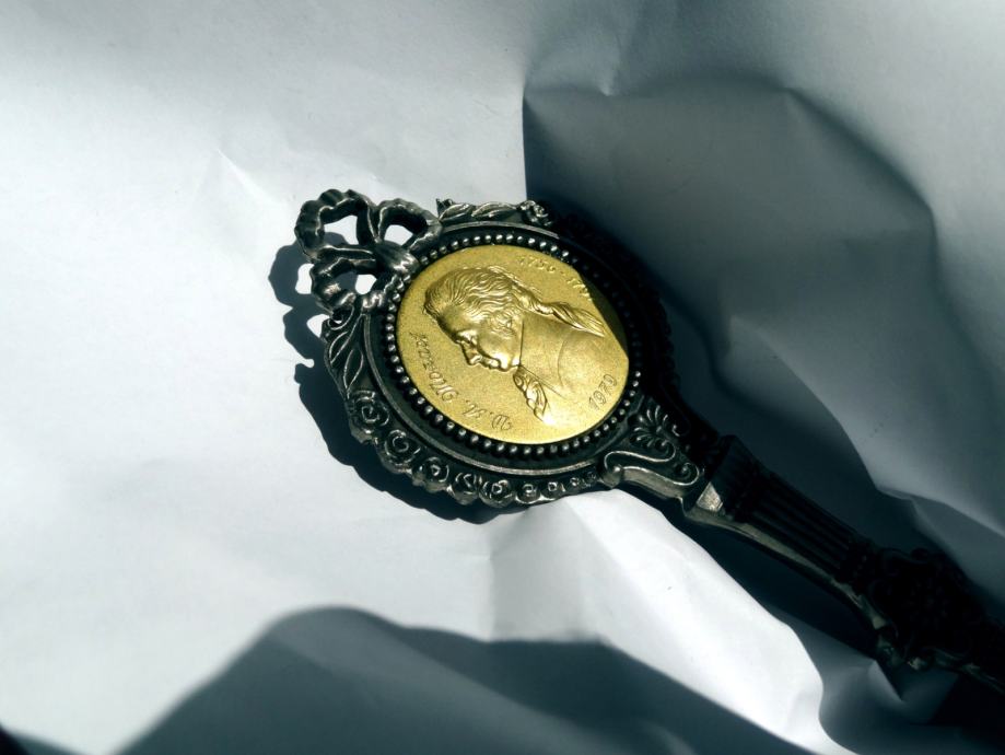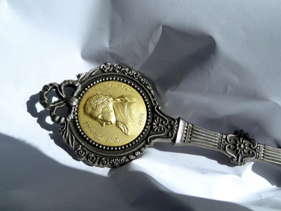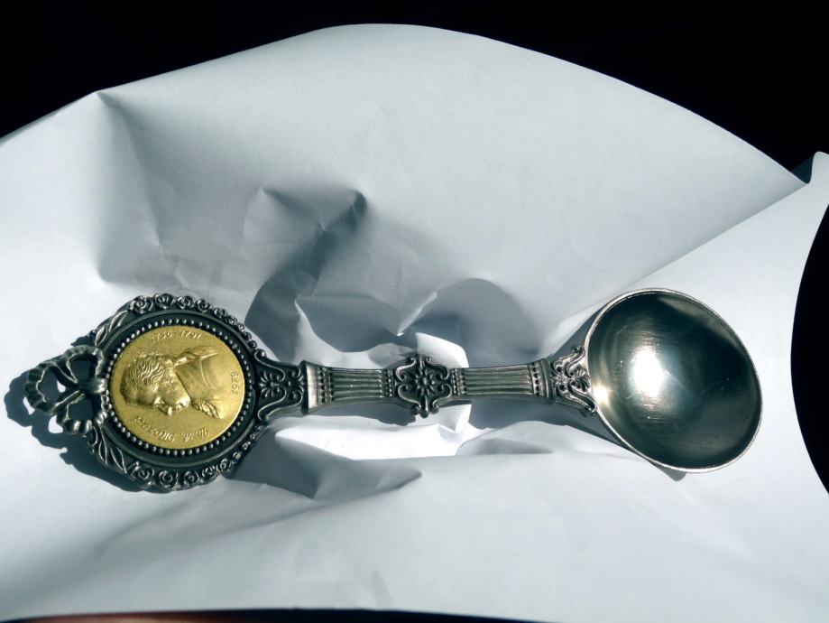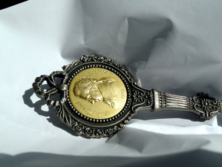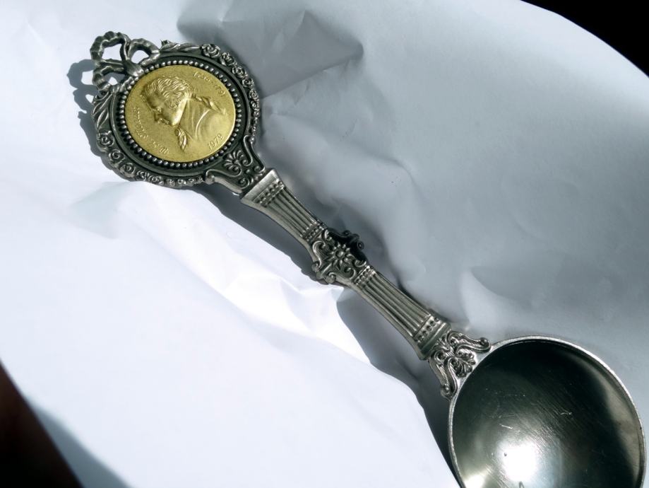 Kovanec je verjetno pozlačen. Lepa zbirateljska reč. Žlica je velika in jo je mogoče obesiti na steno z lesenim nastavkom, ki ni na slikah. Pošta 5 EUR.