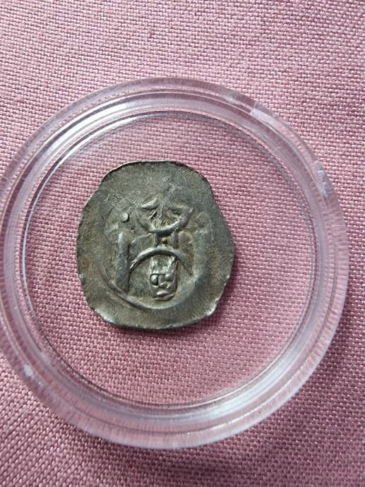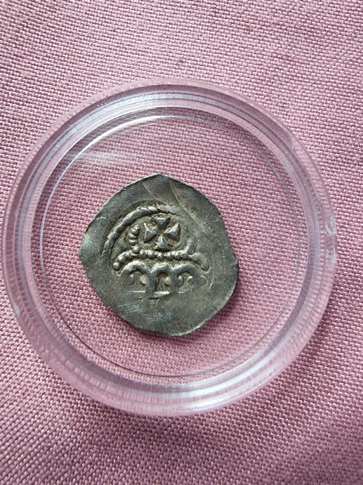 Hälbling o. J. Av: Bischofskopf in einem Kirchenportal mit zwei kurzen durch Kugeln abgeschlossenen Türmen und einem ober einem Bogen aufragenden Kirchengiebel. Rv: über einer Mauer drei Rundbögen, darüber ein Kreuz in einem nach oben gekehrten Halbbogen. CNA Cu6, =0,69 g= III+/II-