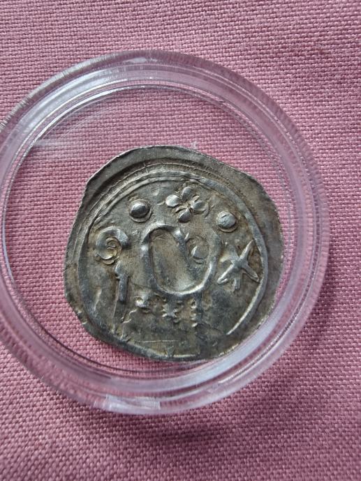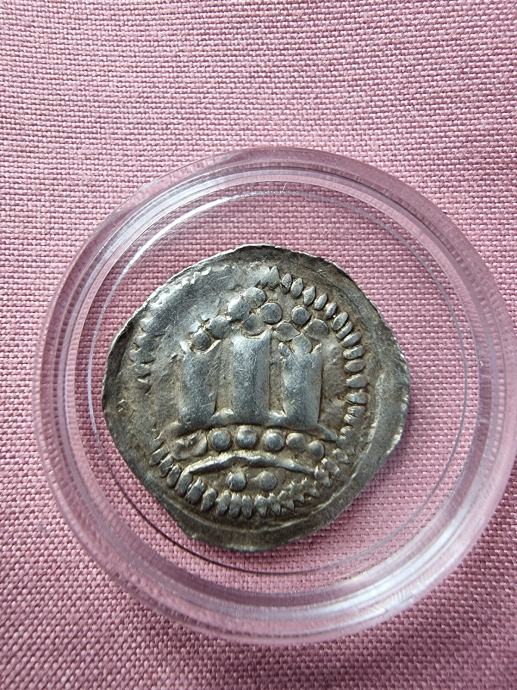 Pfennig o. J. Friesach. Av: geistliches Brustbild mit Krummstab, darüber Punkt, zur Seite ein Stern. Rv. Doppelbogen darauf drei Säulen mit Kreuzen besetzt, im Bogen 6, darunter 2 Punkte. Zwischen den Säulen ein Ringerl, CNA VS. B Fz7a/Ca6 Rs, =1,20 g= II-