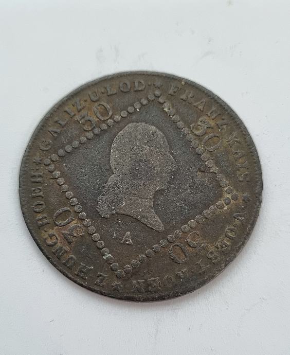 V odličnem stanju, največji bronasti novec Habsburžanov za 30 krajcarjev cesarja Franc II.