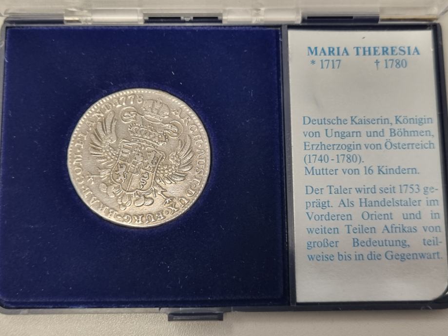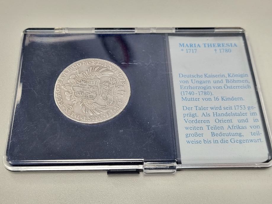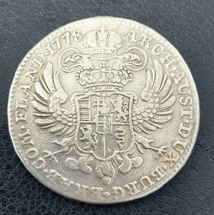 Veliki srebrni novec cesarice Marije Terezije s certifikatom, ki je bil plačilno sredstvo na celotnem slovenskem ozemlju. Letnik 1778, zelo lep, za vsako resno zbirko.