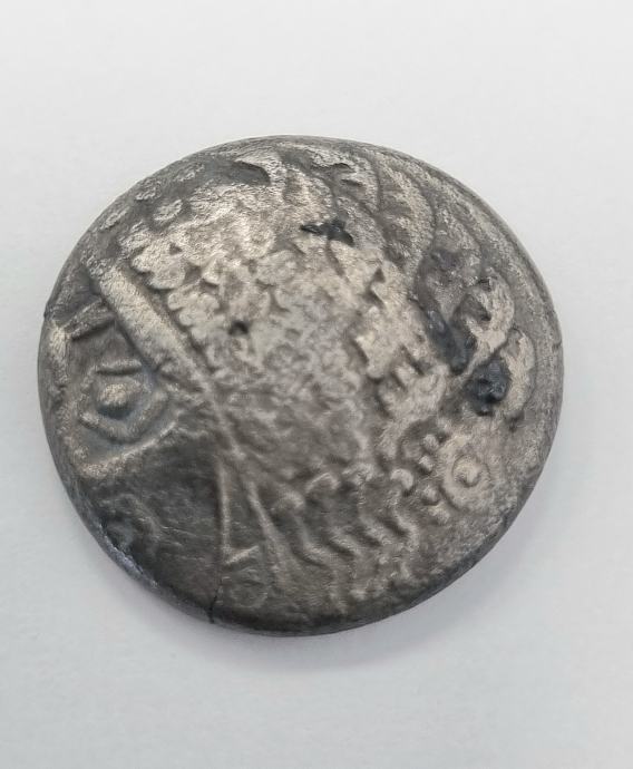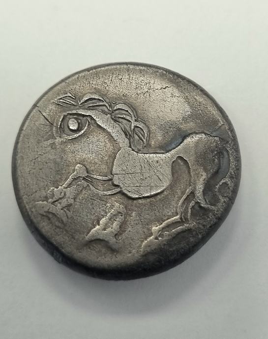 Keltska srebrna tetradrachma noriškega plemena Tavriskov (Vrhnika - Ljubljana), tip Samobor A varianta v odlični izvedbi in kvaliteti, 9,10 g, 23 mm, kupljen v avkcijski hiši leta 2007. Za vsako resno zbirko slovenske numizmatike.