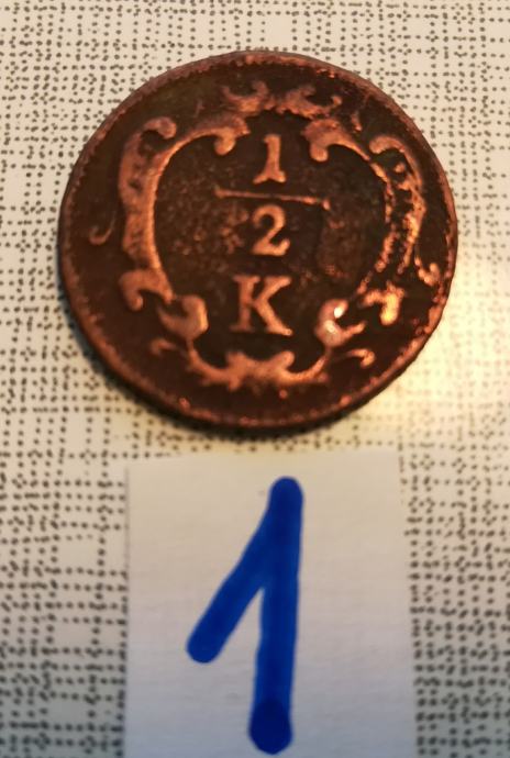 - zadaj stran : napis vrednosti 1/2 K (Kreutzer) obdan z baročnim okrasjem