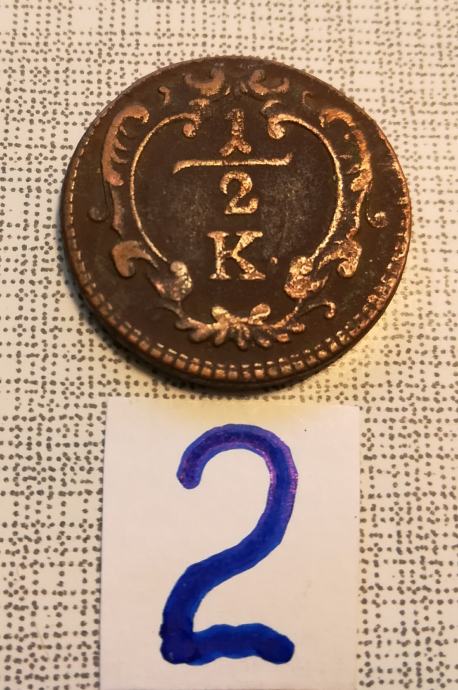 - zadnja stran : napis 1/2 K (Kreutzer) obdan z baročnim okrasjem