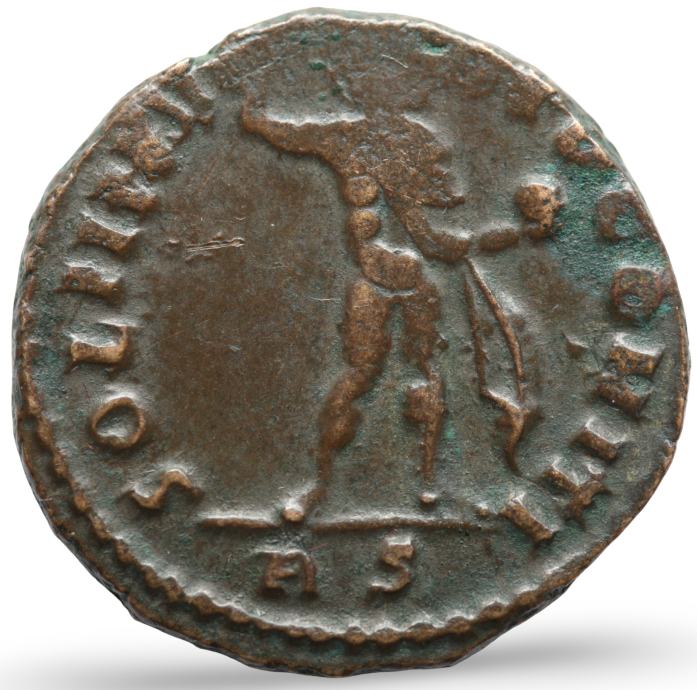Rev: Sol stoji desno, glava levo, klamida visi zadaj z leve rame, drži globus navzgor in dvigne desno roko; v exergue RS.