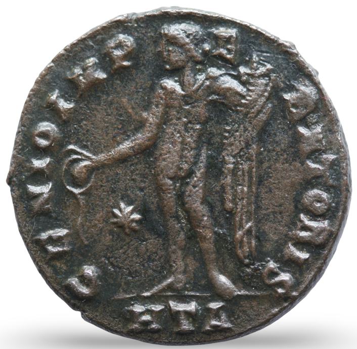 Sprednja stran: Genij stoji levo gol, oblečen v modij, hlamida čez levo ramo (pada nizko), drži patero, iz katere teče tekočina, in rog izobilja, zvezda v levem polju; v npr. HTA.