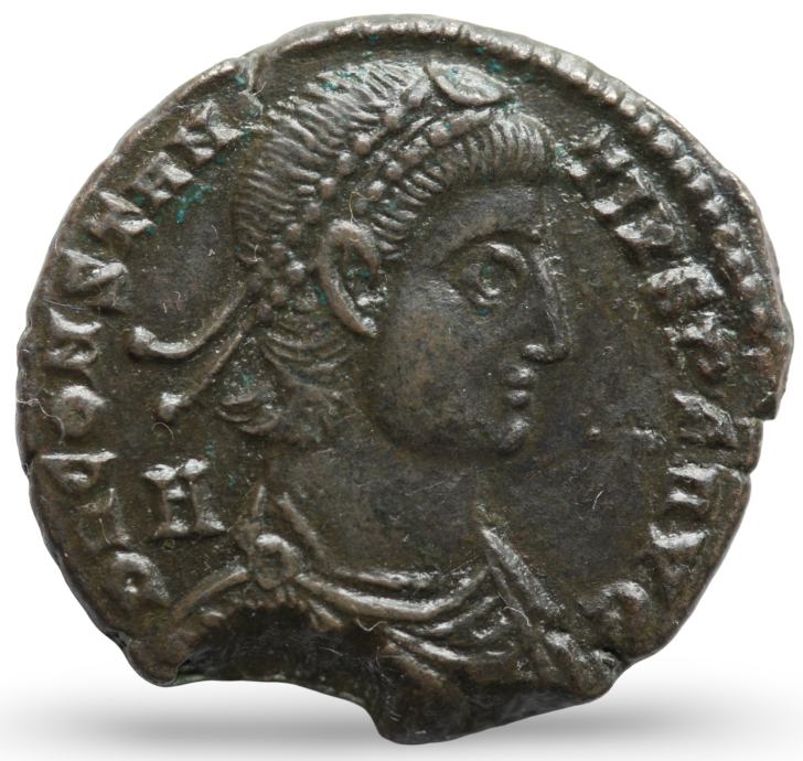 Spredaj: Doprsni kip desno z diademom, drapiranim in oklepom; A za glavo.