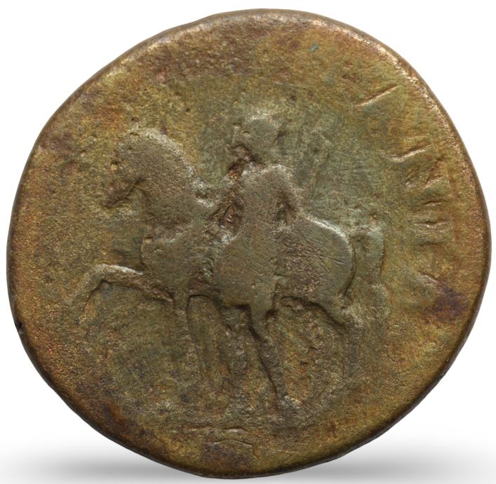 Rev: Mavretanija stoji levo pred konjem, ki drži dve kopji; v exergue, S C.