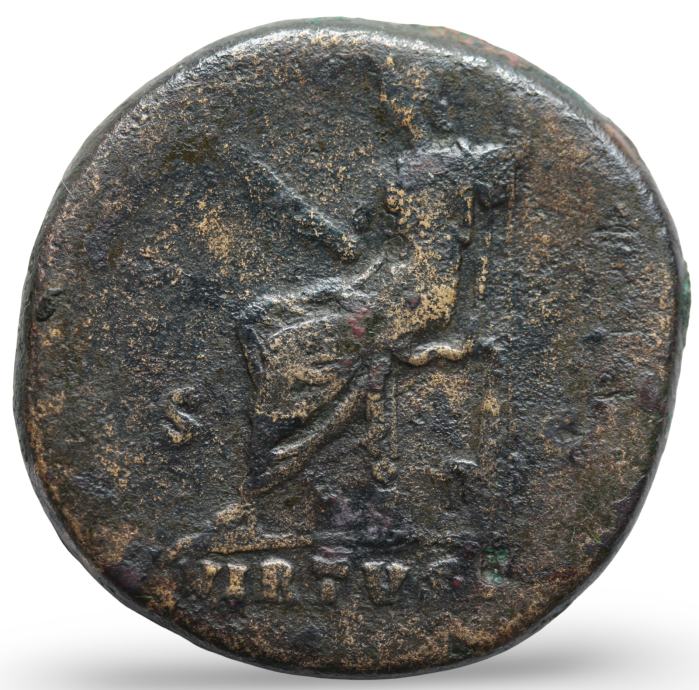 Rev: Virtus sedi levo, drži parazonij in sulico.